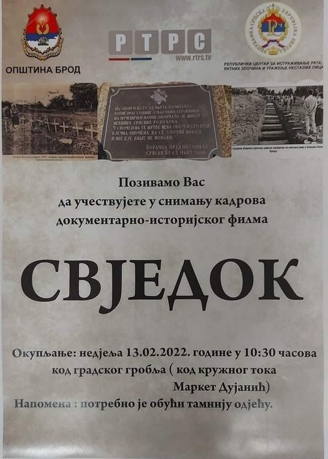 Ово је наставак документарног историјско-биографског филма “Свједок” режисера Дениса Бојића, у продукцији Радио-телевизије Републике Српске и Републичког центра за истраживање рата и ратних злочина и тражење несталих лица. Градско гробље у Броду је једна од пет локација на којој ће бити снимани кадрови за филм који говори о масовним српским страдањима и подсјећање на рад доктора – патолога Зорана Станковића.