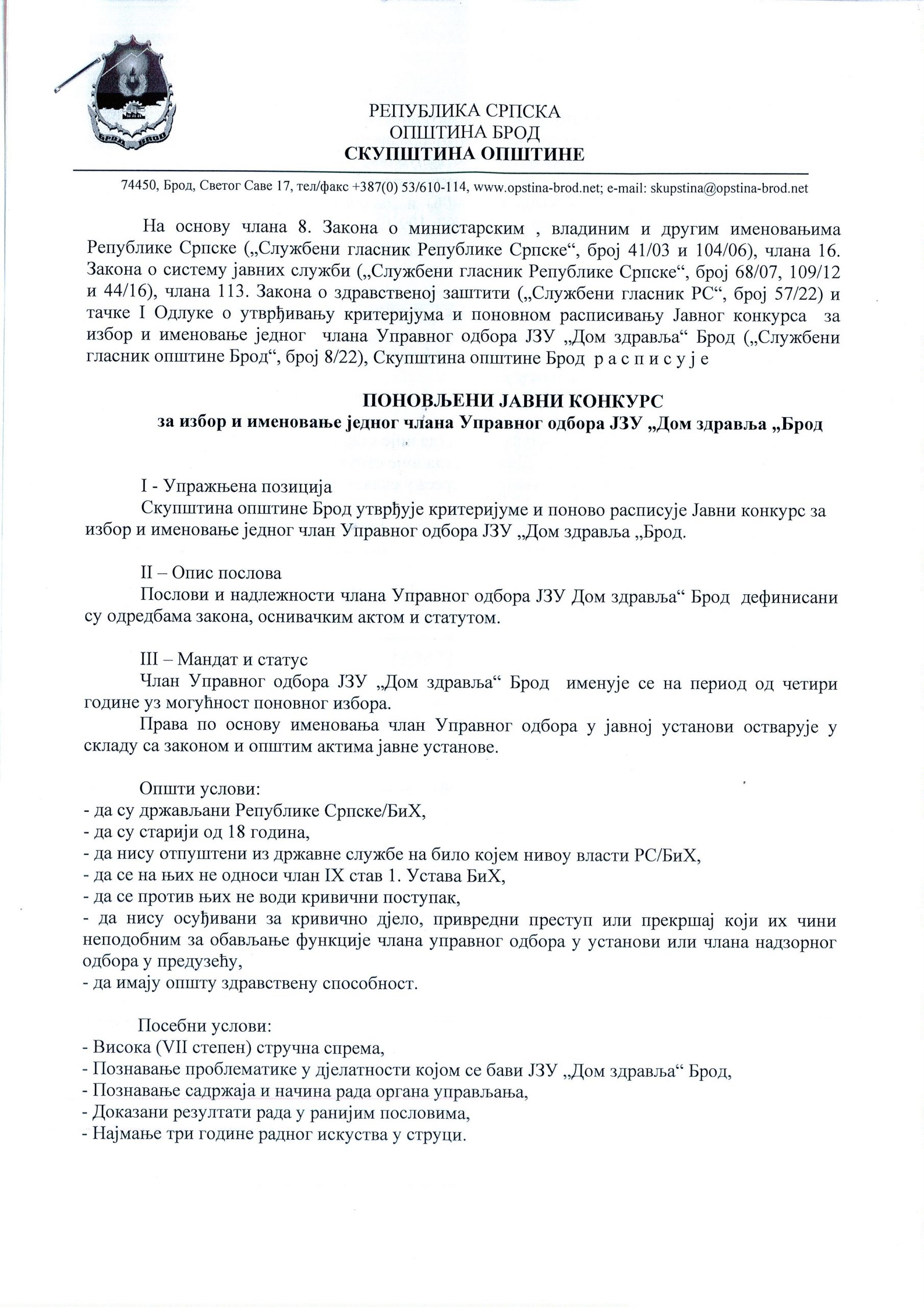 Скупштина општине Брод утврђује критеријуме и поново расписује Јавни конкурс за избор и именовање једног члана Управног одбора ЈЗУ „Дом здравља“ Брод – конкурс можете преузети на линку. Члан Управног одбора Управног одбора ЈЗУ „Дом здравља“ Брод именује се на период од четири године уз могућност поновног избора.